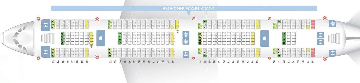 Кресла пассажиров расположены в три ряда по схеме 3х4х3. Общее количество мест в салоне эконом – 399.