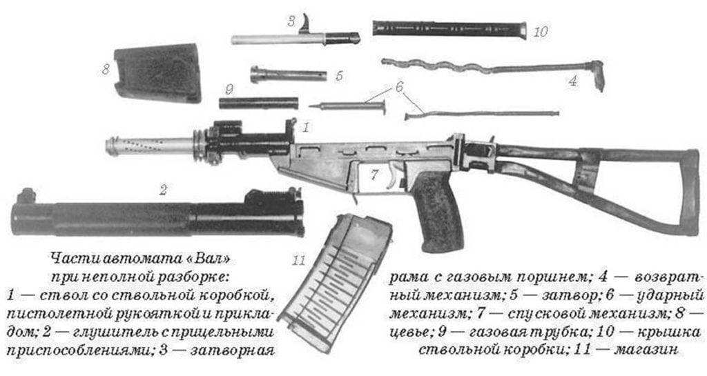 Приклад (b) — трубчатый, складной влево, металлический, достаточно прочный для использования в ближнем бою, в сложенном состоянии не препятствует стрельбе. Шершавая поверхность пистолетной рукоятки позволяет прочно удерживать её, чему также способствует и сама форма рукоятки. Пистолетная рукоятка, цевьё (b) и двухрядные магазины — пластиковые (b) . Встроенный глушитель играет также роль пламегасителя (b) . Благодаря ему и патронам с дозвуковой скоростью уровень звукового давления при выстреле составляет 130 дБ (b) . Переводчик режимов огня расположен в задней части спусковой скобы, а предохранитель и рукоятка перезаряжания — справа. Несмотря на улучшения в эргономике, в сравнении с автоматом Калашникова полностью двусторонним оружием «Вал» назвать нельзя: стрелку приходится убирать руку с пистолетной рукоятки для того, чтобы снять оружие с предохранителя или передёрнуть рукоятку затвора (для осуществления этих операций левой рукой приходится наклонять и разворачивать автомат). Также в качестве недостатков стоит отметить лязг затвора и случаи повреждения пулей при выстреле.