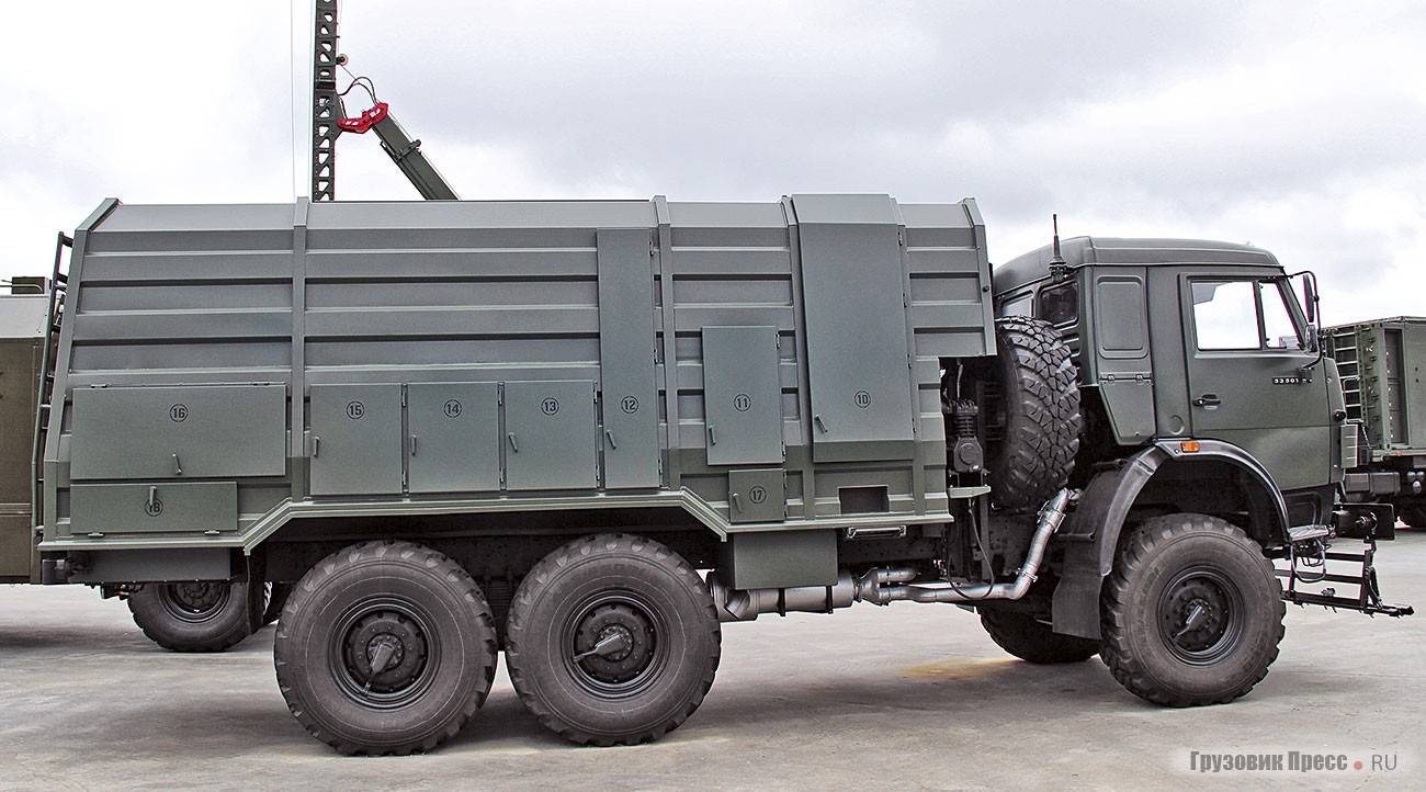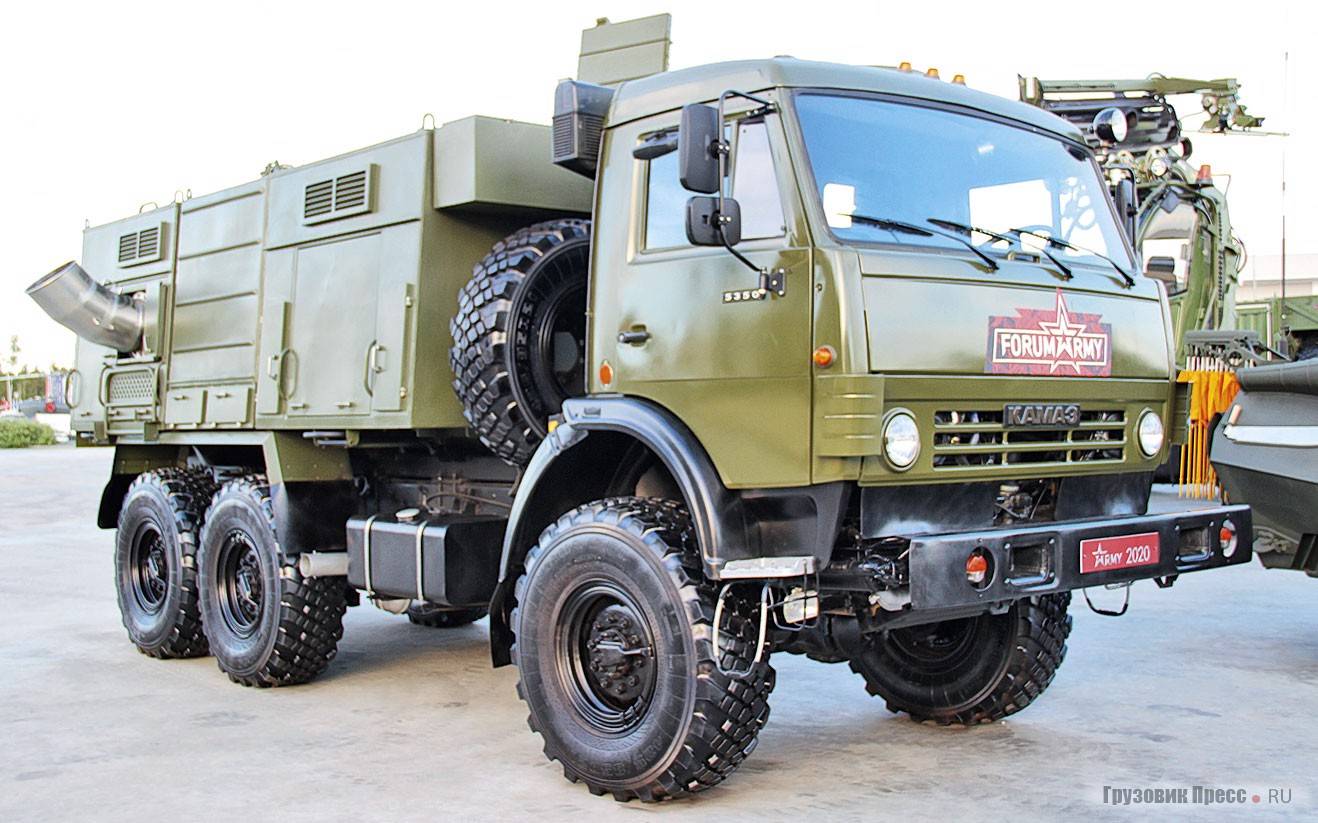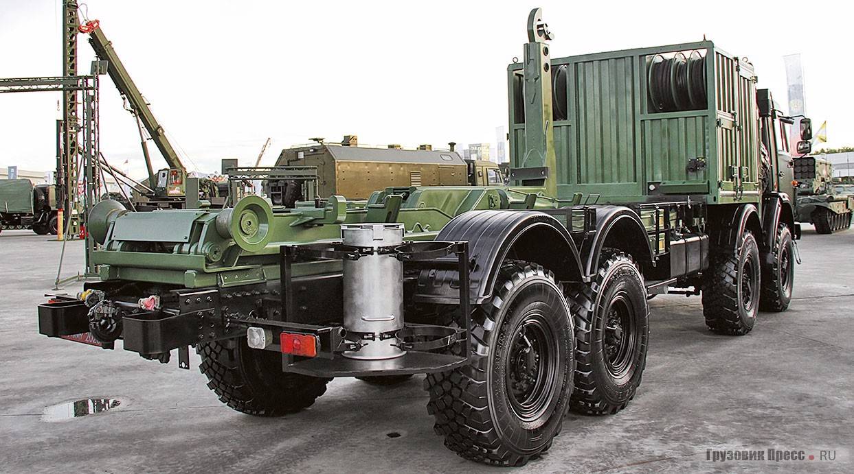 Трансмиссия автомобиля – механическая ступенчатая, с КПП на пять передач прямого хода, двухступенчатой раздаточной коробкой, обеспечивающей автоматическое подключение и отключение переднего моста с шариковыми шарнирами равных угловых скоростей, и с проходным средним мостом. Мосты неразрезные, подвеска передних колёс – на полуэллиптических рессорах, две задние оси сблокированы в тележку с балансирной подвеской. Ошиновка всех колёс – односкатная. Автомобиль оборудован системой централизованного регулирования давления воздуха в шинах.