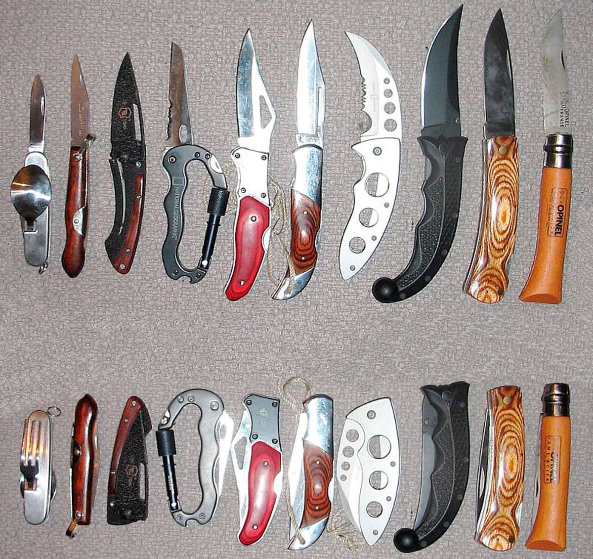 Образцы различных складных ножей в сложенном и раскрытом виде