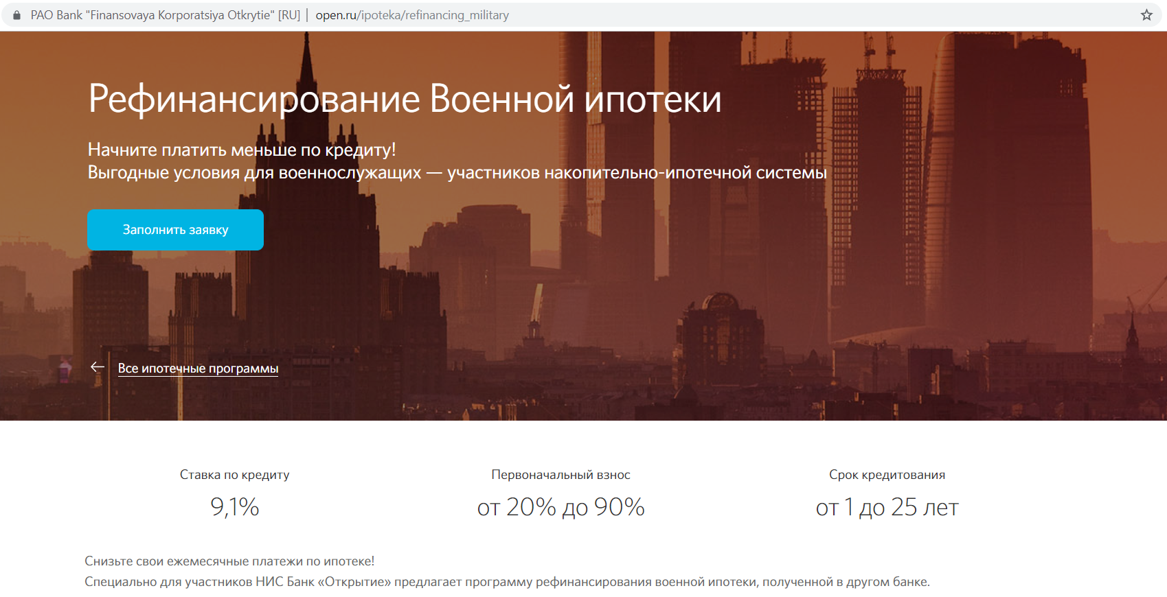 Для заключения в банке “Открытие” договора на рефинансирование военной ипотеки заявитель должен соответствовать следующим требованиям: