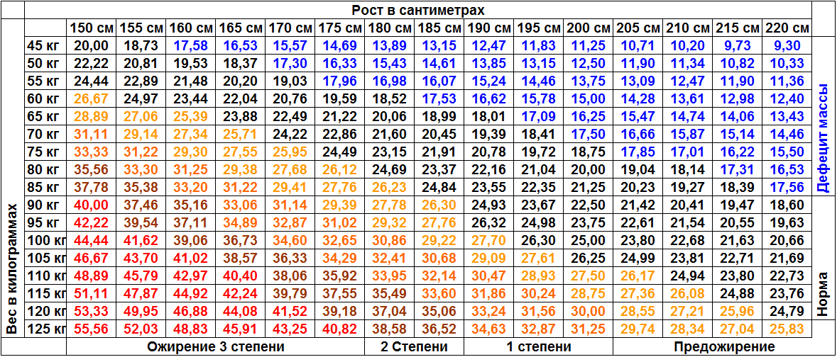 Для сведения призывников зависимость показателей ИМТ и градации телосложения: