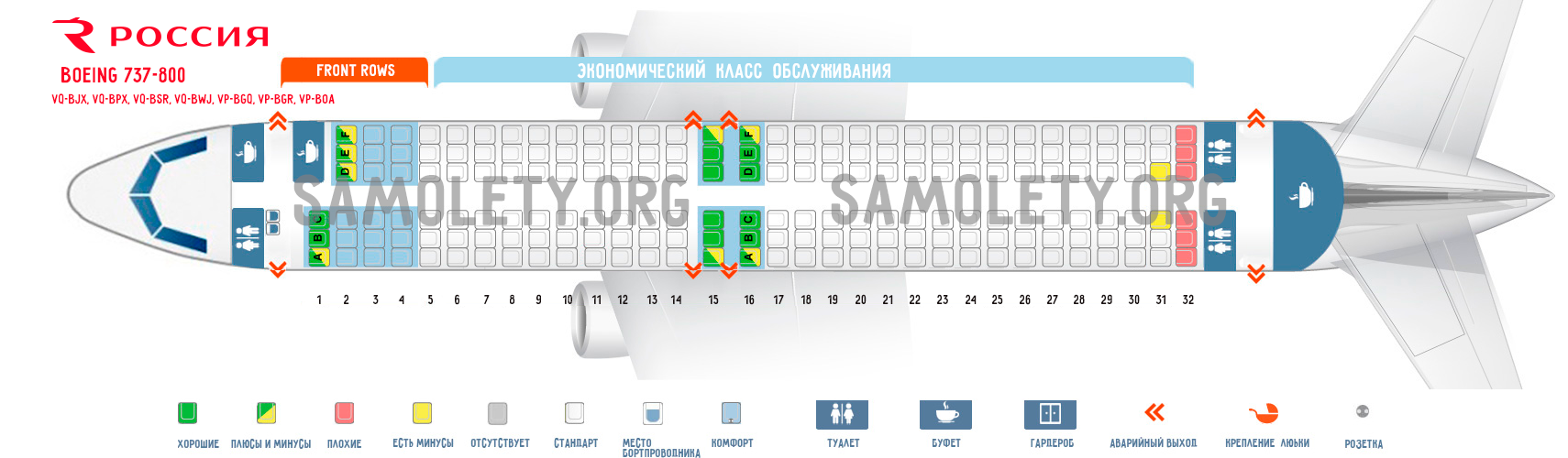Рассмотрим расположение мест в самолете только одного класса. У «России» такая схема салона Боинга 737-800 рассчитана на 189 пассажиров и состоит из 32 рядов.