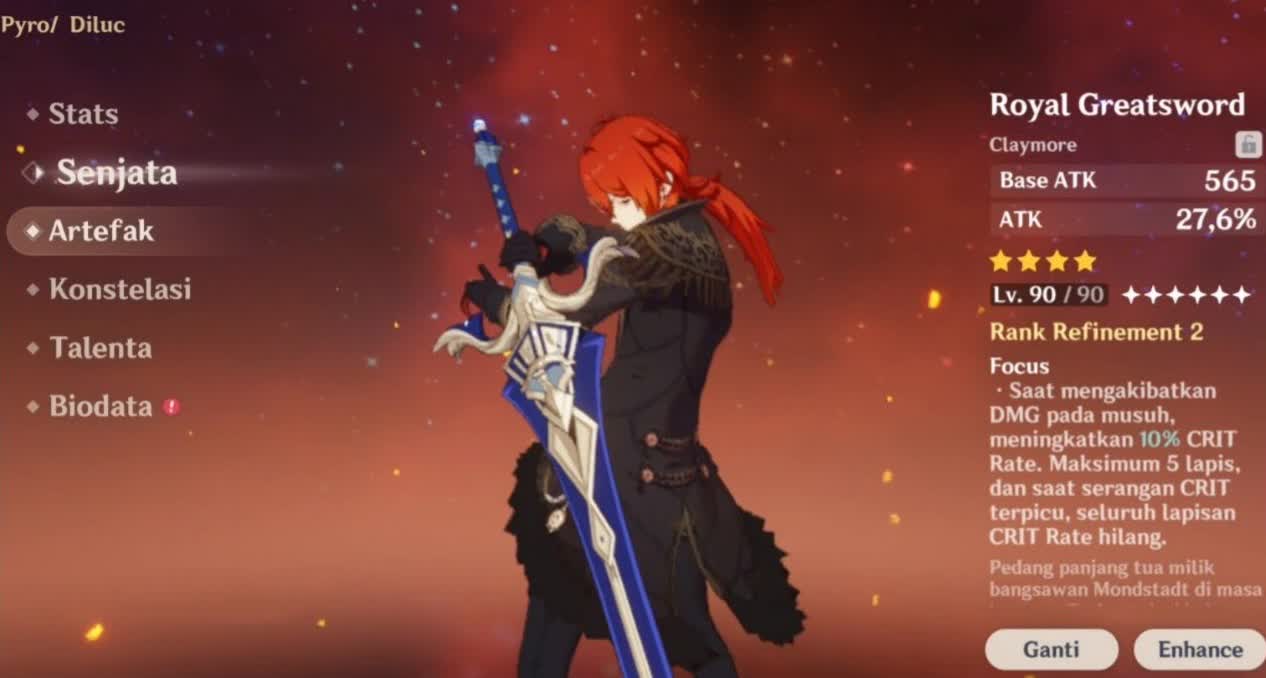 Это одно из лучших оружий для массовых сражений. Оно отлично подходит второстепенным дамагерам, которые не обладают убойным точечным уроном — с Небесным величием они смогут дамажить группы противников, тем самым внося огромный вклад в победу. Под такую роль вы можете качать Чун Юнь, Ноэлль, Дилюка и Синь Янь — все они будут в восторге от Небесного величия.