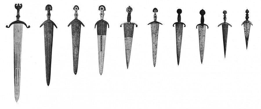 - Рондел — длинный кинжал с плоской круглой гардой и таким же навершием, и с узким, стилетообразным клинком.