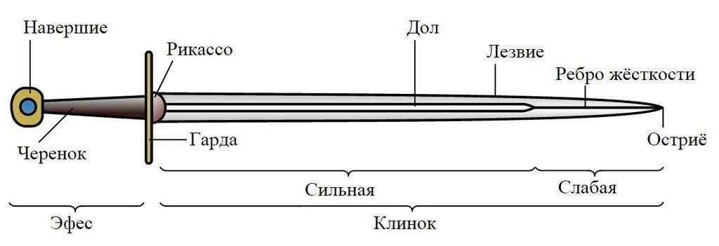 Меч состоит из двух частей: клинка и эфеса. Режущая кромка клинка называется лезвием, заканчивался клинок остриём. Как правило, он имел ребро жесткости и дол – углубление, предназначенное для облегчения оружия и придания ему дополнительной жесткости. Незаточенная часть клинка, прилегающая непосредственно к гарде, называется рикассо (пятка). Клинок также можно разделить на три части: сильная часть (нередко ее вообще не затачивали), средняя часть и остриё.