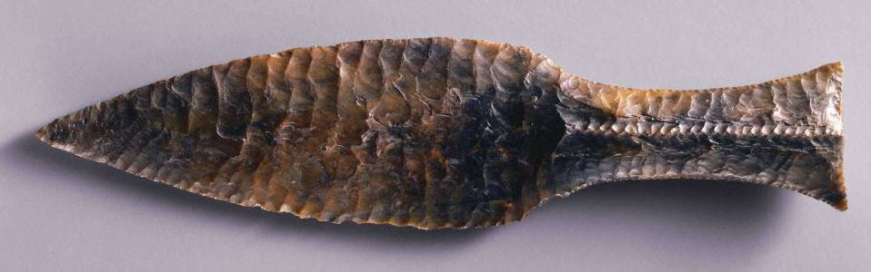 Именно такой более продуманный нож обнаружили в ирландском захоронении Хелпер Торп. Нож был сделан из бронзы и относился примерно ко 2-ому тысячелетию до нашей эры. Это оружие непосредственно имело сильно зауженный клинок в 8 сантиметров с сечением в форме ромба и срединную ширину в 1,5 сантиметров. Рукоятка крепилась к клинку с помощью заклепок и отверстий в задней части клинка.