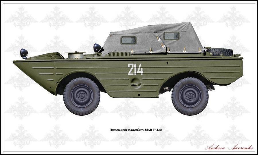 , скорее, был похож на катер. Приборный щиток МАВ был полностью позаимствован с внедорожника ГАЗ-69. При этом на щитке приборов имелись тахометр и сигнальная лампочка, которая оповещала о появлении воды в трюме. Рычаги управления трансмиссией находились с правой стороны от водителя. Кронштейны педалей отличались своей необычной формой и находились близко друг к другу, для того чтобы было как можно меньше разных технологических отверстий, через которые вода могла попасть внутрь корпуса автомобиля. Рама ветрового стекла могла быть уложена на капот, а над пассажирским отсеком можно было легко растянуть тент из брезента. Передний ряд сидений включал в себя два кресла: для командира и водителя. Позади них была смонтирована трехместная скамья, не имевшая регулировок. Для удобства обслуживания в кабине автомобиля был установлен топливный фильтр.Плавающий автомобиль ГАЗ-46 (МАВ) поступал на вооружение отдельных переправочно-десантных батальонов, а также отдельных понтонно-мостовых полков, помимо этого он экспортировался в страны, которые были участниками Варшавского договора. Выпуск автомобиля продолжался в Советском Союзе с 1953 по 1958 год, когда производство базового ГАЗ-69 было передано на завод УАЗ. При этом в Ульяновске просто не было производственной возможности, чтобы продолжать выпуск плавающего автомобиля, что, наряду с небольшой потребностью в подобных машинах, послужило причиной к прекращению их выпуска. К тому же в армию тогда уже начали поступать первые БРДМ. Точной информации о количестве выпущенных МАВ нет, но, по всей видимости, всего было собрано около 650 таких автомобилей.