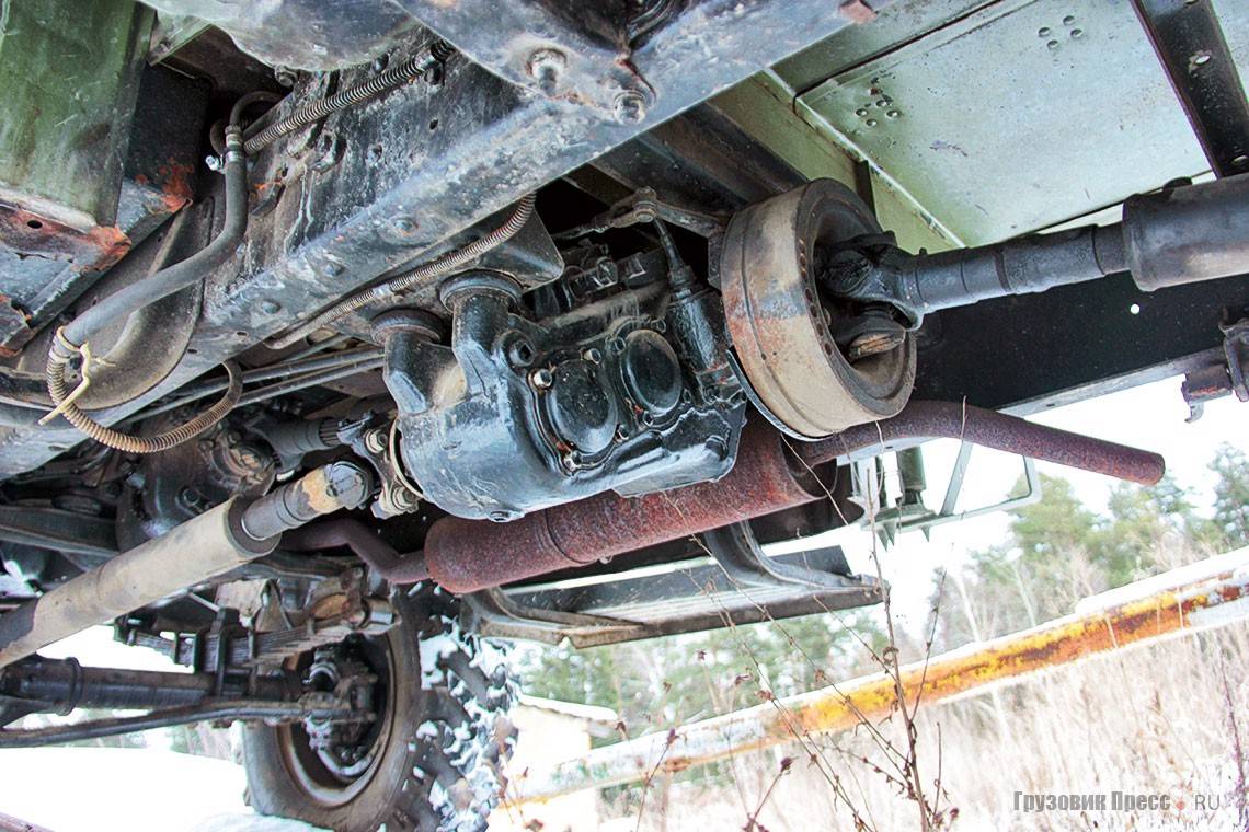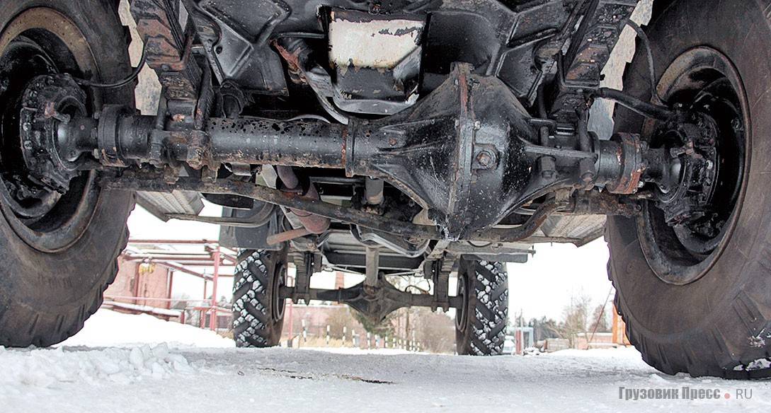 Как уже говорилось, наш грузовик классической рамной конструкции с системой полного привода с отключаемым передним мостом, короткими свесами и односкатными колёсами с регулируемым давлением шин. Шины применены повышенной проходимости, размер 10,00-18’’. Давление в них можно корректировать при преодолении различных видов бездорожья, в переделах от 4 до 0,5 кгс / cм2.