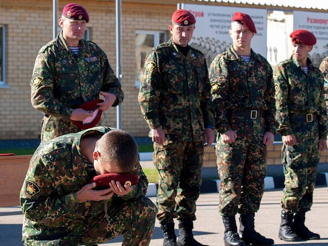 Военнослужащий выходит из строя, принимает берет, встает на колено, целует его, одевает и произносит «Служу Российской Федерации и спецназу!».