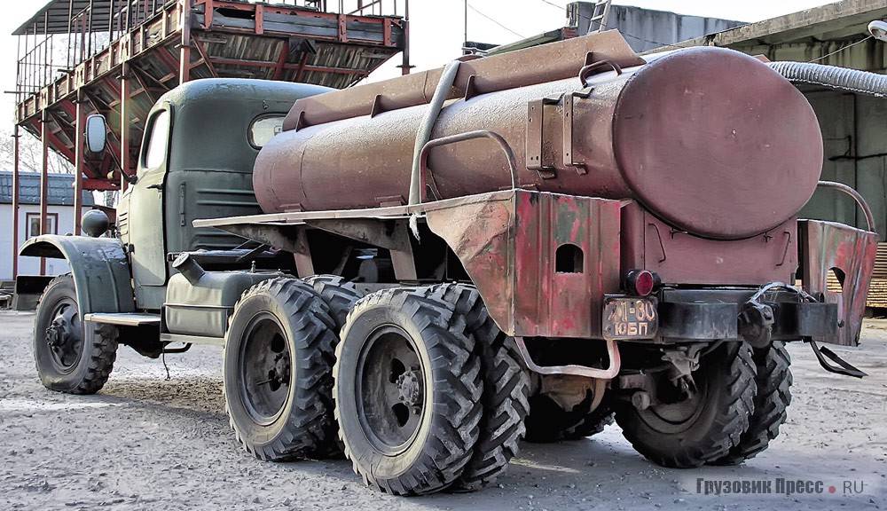 Удивляться в тот день мне пришлось много раз. Очередным откровением стал тот факт, что мне удалось удобно расположиться за рулём, чего я никак не ожидал от этой кабины. В этом вопросе я, честно говоря, очень привередлив. А тут и слегка вытянутые руки за огромной баранкой, и ноги в коленях сильно сгибать не пришлось. В грузовиках, да и легковушках полувековой давности не часто можно устроиться так удобно. Обзорность из крохотных окошек высокой кабины, как и ожидалось, неважнецкая, но так ли она принципиальна в поле или на лесной дорожке? Под аллигаторным капотом всего 92 «лошадки», а крутящий момент 343 Н∙м, но зато с самых низов позволяют уверенно двигаться по заснеженному полю и раскисшей просеке. На полу в кабине целый «кустарник» из четырёх рычагов: коробка передач, «раздатка», блокировка, стояночный тормоз. Всё включается чётко, даже ходы не слишком велики, но напольные педали конечно же «ватные». Скорость 30 км / ч при движении по снежному полю кажется высокой, это ощущение дополняют постоянные подскоки и прыжки негружёной машины даже на больших ухабах. Максимум, согласно паспортным данным, можно разогнаться до 55 км / ч. Быстрее на этой машине, честно говоря, и не хочется, её основная ценность как раз в том, чтобы двигаться «по местности», а не дорогам, и с этой задачей наш «151-й» ЗИС справляется играючи! Иногда ещё и прихватив с собой три-четыре кубометра воды в собственной цистерне, но это летом.