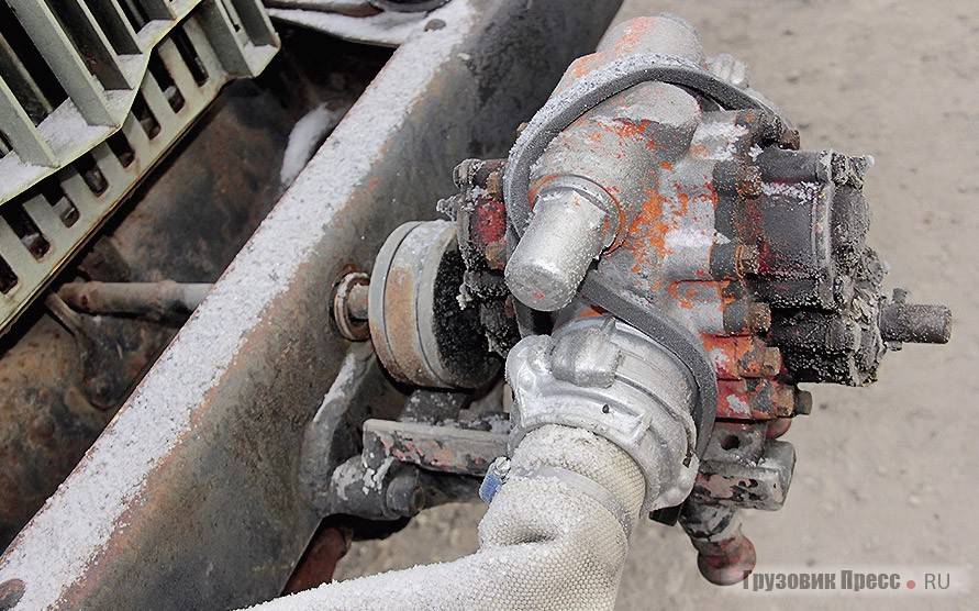 Передние колеса монтируются на шкворневых цапфах с большим запасом прочности. Поворотные кулаки приводятся в движение тягами, которые взаимодействуют с червячным механизмом рулевой колонки. Гидроусилителя руля в то время не было, поэтому крутить баранку на тяжелом военном грузовике было под силу только физически выносливым и подготовленным рядовым срочной службы.