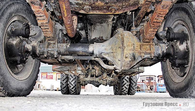 Два задних моста грузовика полностью идентичны по размерам, тормозным механизмам и креплениям. Вращение от двигателя и трансмиссии передается через карданные валы на дифференциалы, затем — на полуоси, которые оканчиваются мощными несущими фланцами. Колеса надеваются на полуоси и прикручиваются десятью гайками типа футорка.
