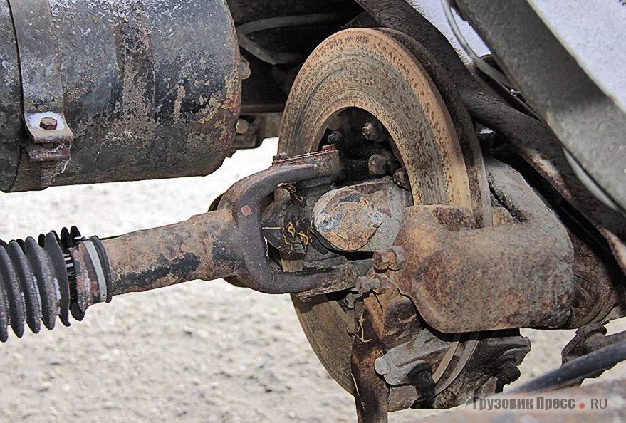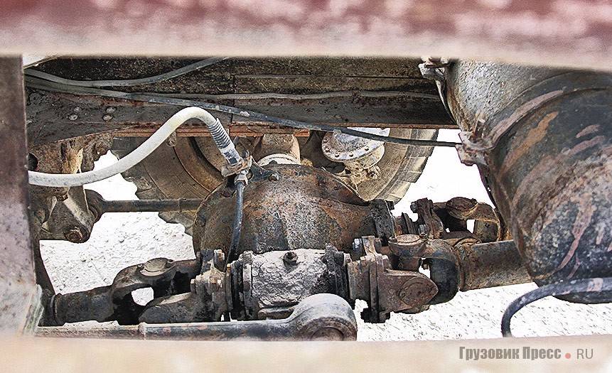 Рассматривая изобилие карданных передач (задние мосты не «проходные», поэтому в трансмиссии трудятся пять карданных валов и 10 крестовин), я обнаружил интересный артефакт – дисковый механизм трансмиссионного тормоза, причём вентилируемый! Что это? Новодел, приспособленный от списанного современного авто или опередившее время решение? Изучив литературу, я нашёл соответствующий чертёж дискового трансмиссионного тормоза (стояночная тормозная система). Такое решение сохранилось и на последующих моделях ЗИЛ-157 и ЗИЛ-164, но из-за возросшей мощности, грузоподъёмности и полной массы на ЗИЛ-130 вернулись к привычному барабану, так как такая конструкция более эффективна при одинаковых радиусах приложения приводных сил.