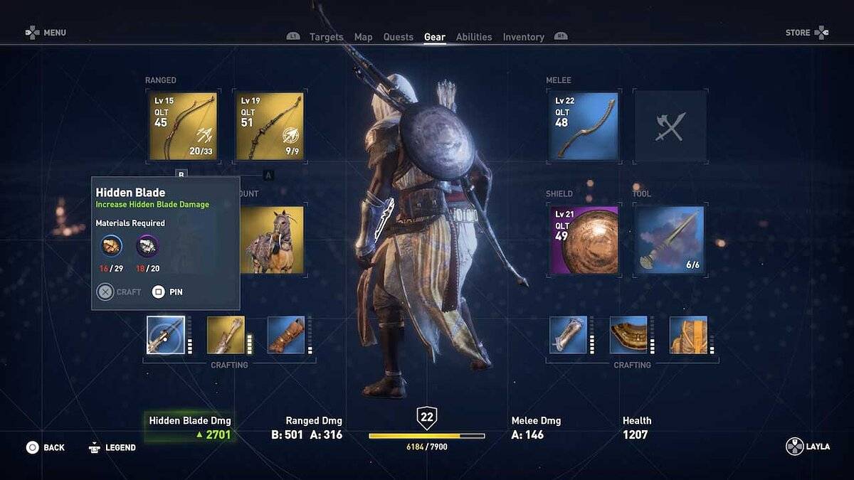 Если вы используете легендарное оружие, но его уровень качества значительно ниже, чем у любого синего, то подумайте над его улучшением. В Assassin’s Creed: Origins очень легко улучшать оружие и щиты. Вам нужно просто посетить кузнеца в любом городе и выбрать понравившийся апгрейд из списка. Для этого вам не понадобятся никакие крафт-материалы — только золото.