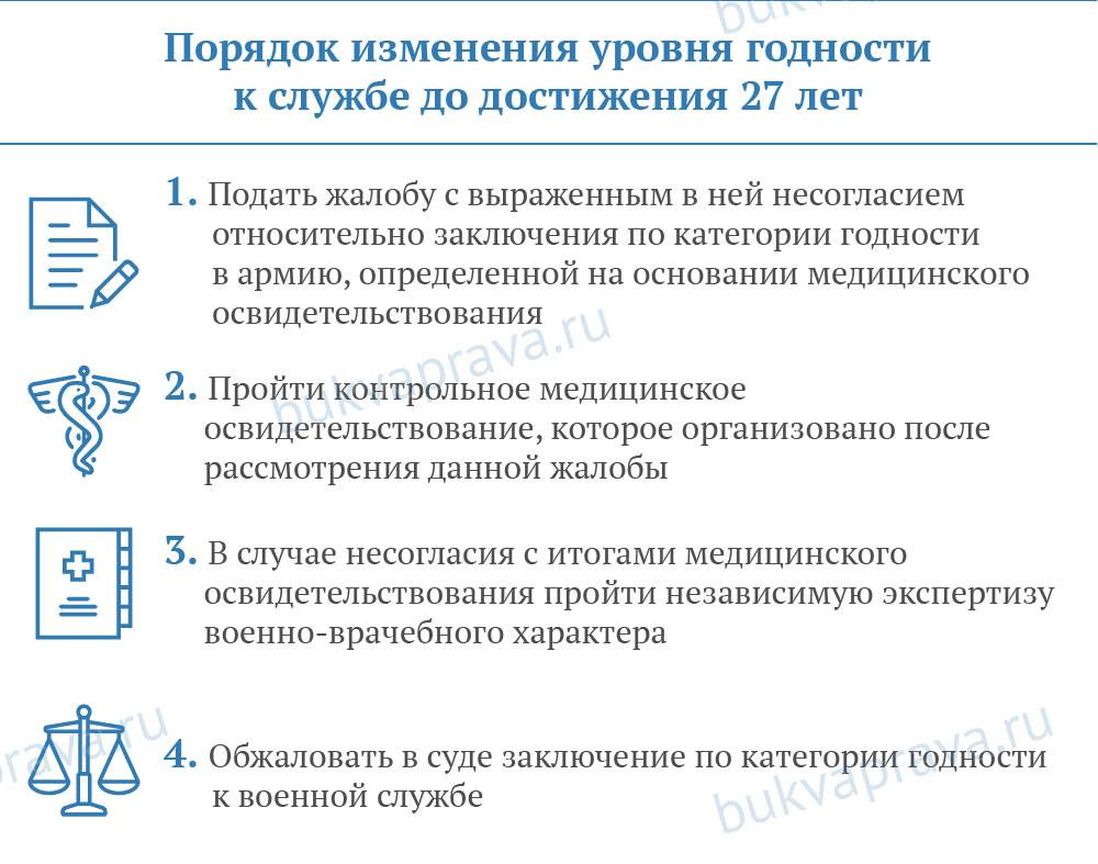 Во-первых, подать жалобу с выраженным в ней несогласием относительно заключения по категории годности в армию, определенной на основании медицинского освидетельствования. Пройти контрольное медицинское освидетельствование, которое организовано после рассмотрения данной жалобы.