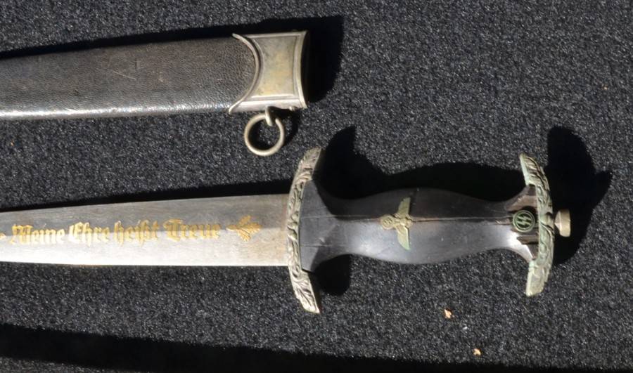 Клинок стальной, прямой, полированный, ромбического сечения, двулезвийный, без долов. В отличном состоянии, без коррозии и тёмных пятен, не точен и не полирован. С одной стороны клинка травлением нанесена надпись готическим шрифтом «Meine Ehre Heisst Treue» («Моя честь зовется верность» — девиз отрядов SS). На основании (пята) клинка нанесено раннее клеймо — Ernst Pack & Söhne, Solingen. Крестовина и навершие из нейзильбера, полированные, в старой патине, не чищены. Рукоять из черного дерева, поверхность в хорошем состоянии. В верхней части, рукоять имеет вставку в виде черного эмалевого глазка с рунами, чёрная эмаль без сколов. В средней части – вставка в виде орла СС, изготовленная из нейзильбера. Орёл и эмблема с рунами родные, не чищены, в старой патине и налёте. Ножны металлические, окрашены в черный цвет, ОРИГИНАЛЬНЫЙ окрас в отличном состоянии. Прибор ножен из нейзильбера, полированный, не чищеный в старой патине. Все четыре оригинальных винта на месте. Всё оригинальное, без вмешательств, ремонтов и реставраций.