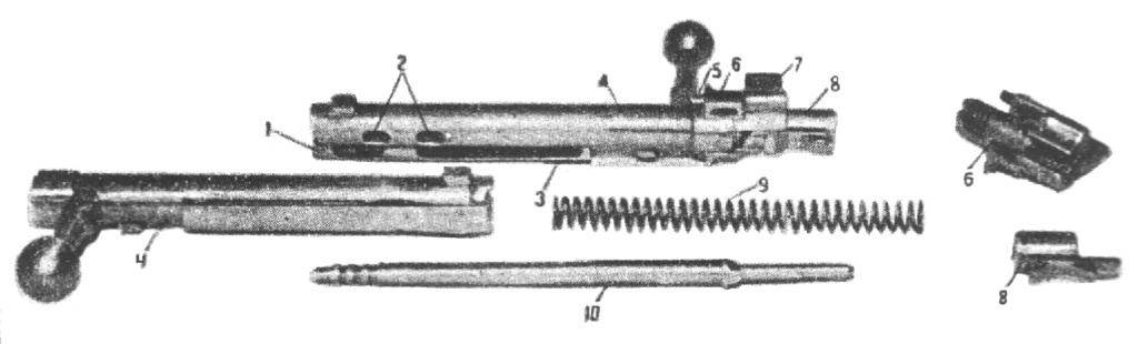 7 — предохранитель; 8 — курок; 9 — боевая пружина; 10 — ударник.