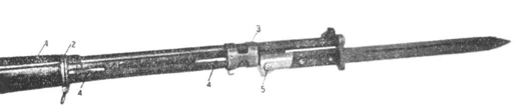 1 — ствольная накладка; 2 — нижнее ложевое кольцо; 3 – верхнее ложевое кольцо; 4 — защелка ложевого кольца; 5 — защелка штыка.
