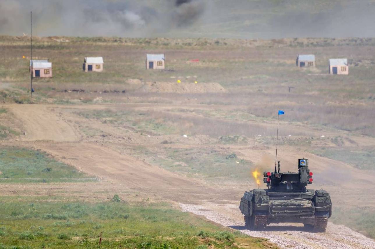 Сухопутные войска продемонстрировали свои возможности во втором эпизоде, который получил название “Атака бронированной тактической группы”. Соединения, включающие в себя танки Т-72, БМП-2, БТР 82А и БМПТ (боевые машины поддержки танков) “Терминатор”, переходили в наступление, ведя огонь в движении.