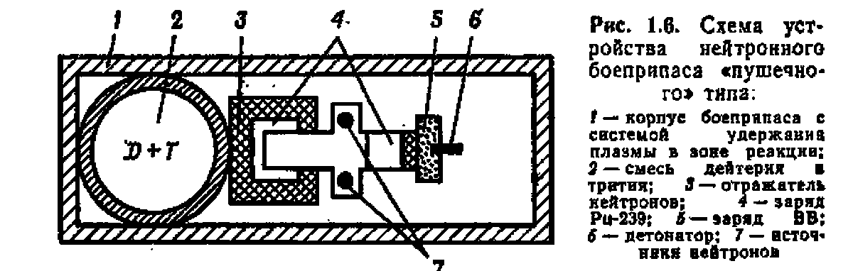 Поток же нейтронов проникает через обшивку ракеты и может вывести из строя системы наведения или систему подрыва боезаряда, или может вызвать частичное разделение ядерного заряда в ракете. По своей конструкции нейтронная бомба близка к атомной, имеет ядерный заряд малой мощности и дополнительный блок с небольшим количеством трития, который служит источником быстрых нейтронов — основного поражающего элемента нейтронной бомбы.
