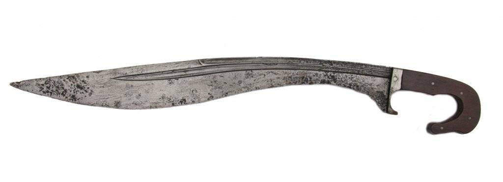 - Лезвие заточено только с внутренней стороны. Преимуществом клинка считается толщина металла, позволяющая наносить мощные и эффективные рубящие удары.