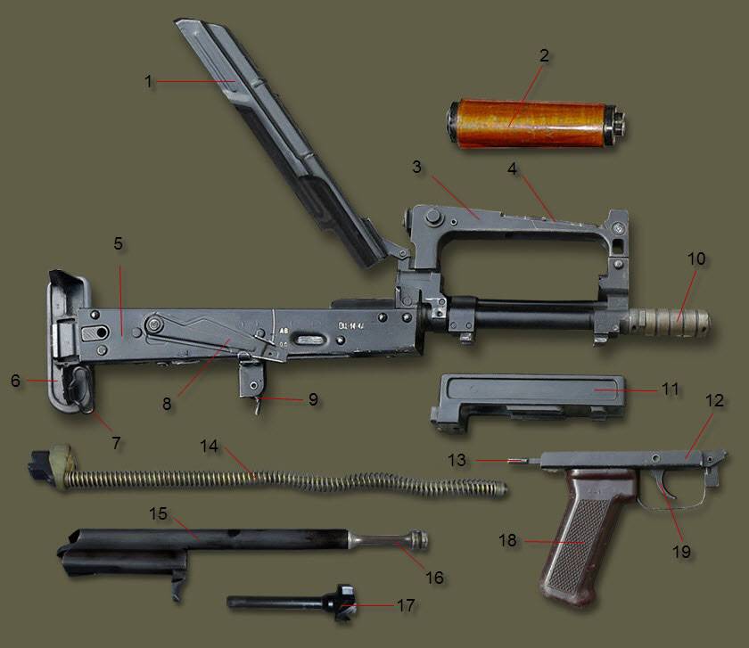 Затыльник заменил приклад. Его установили на заднюю стенку ствольной коробки, чтобы не вносить глобальных изменений в строение корпуса. Длина самой короткой версии — 60 сантиметров. Как говорилось выше, 70% узлов и деталей унифицировали с АК, поэтому купить новые детали для ремонта можно в любом оружейном магазине.