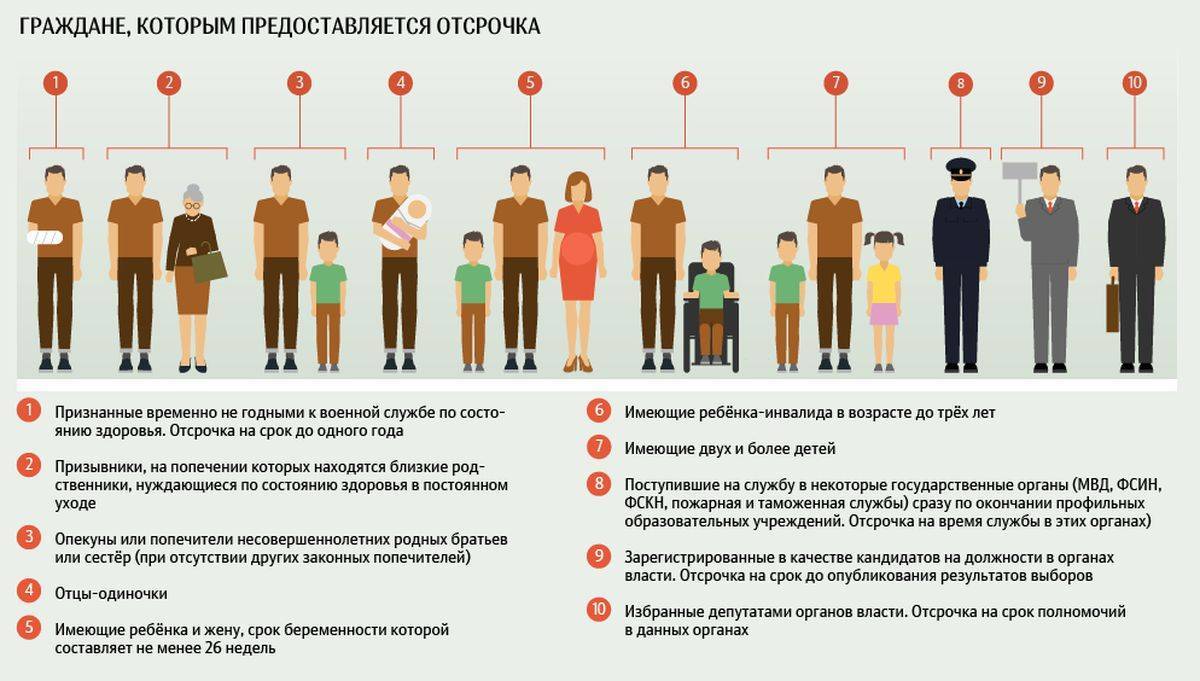 Причиной для отсрочки может служить учёба в ВУЗе (на разных уровнях образования, в том числе и в аспирантуре), а также:
