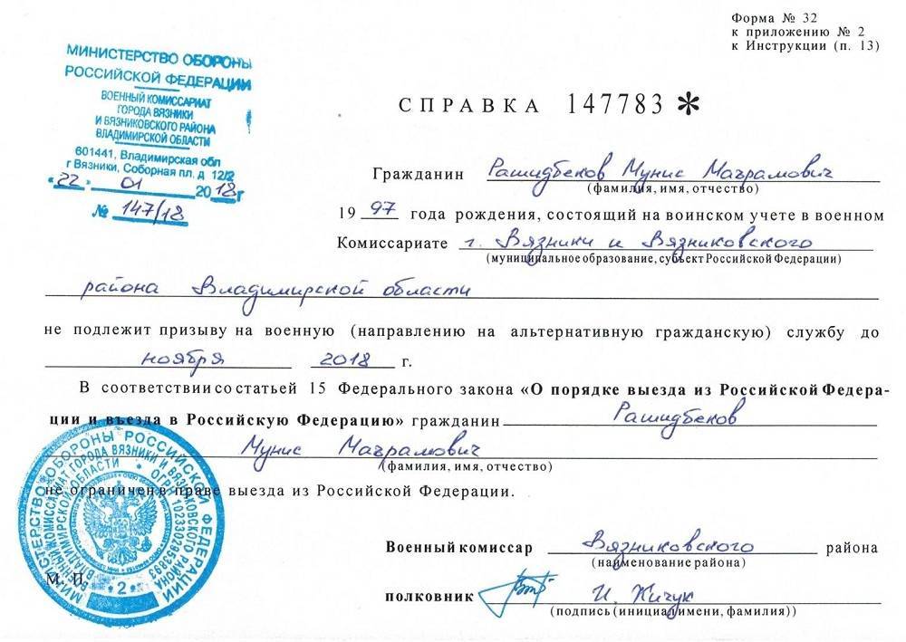 Справка из военкомата оформляется при личном обращении гражданина. Выезжать из страны можно на момент призывного возраста при наличии отсрочки.