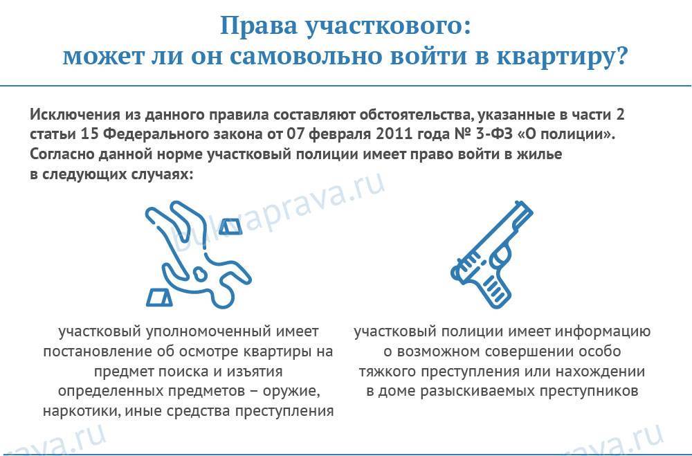 Исключения из данного правила составляют обстоятельства, указанные в части 2 статьи 15 Федерального закона от 07 февраля 2011 года № 3-ФЗ «О полиции». Согласно данной норме участковый полиции имеет право войти в жилое помещение в следующих случаях: