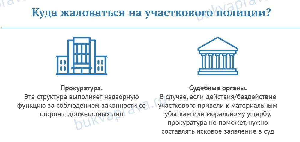 - Судебные органы. В случае, если действия/бездействие участкового привели к материальным убыткам или моральному ущербу, прокуратура не поможет, нужно составлять исковое заявление в суд.