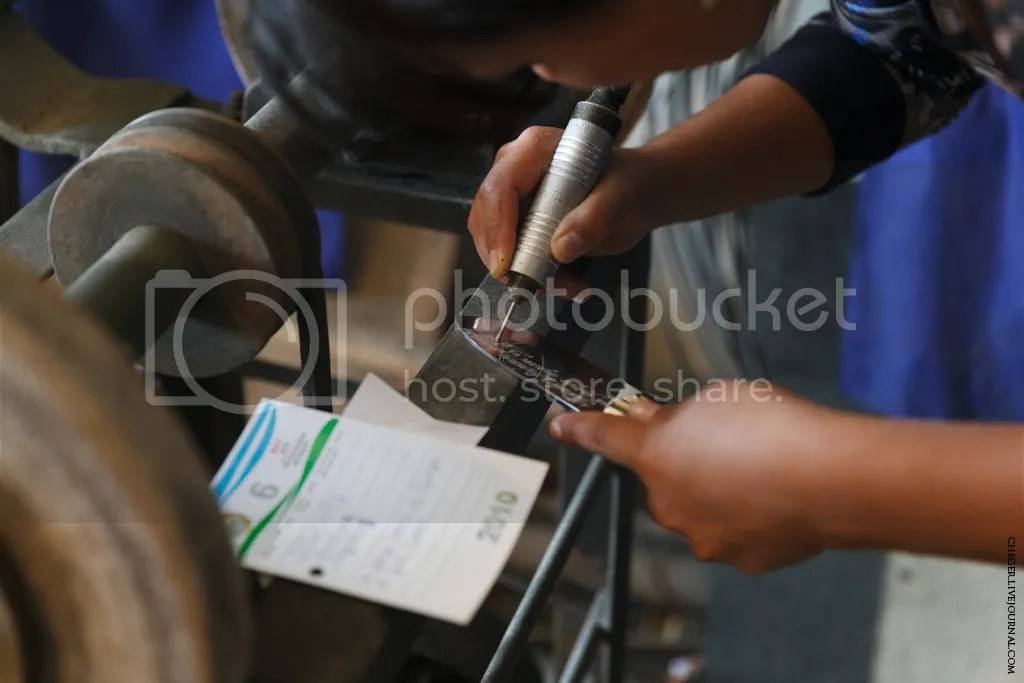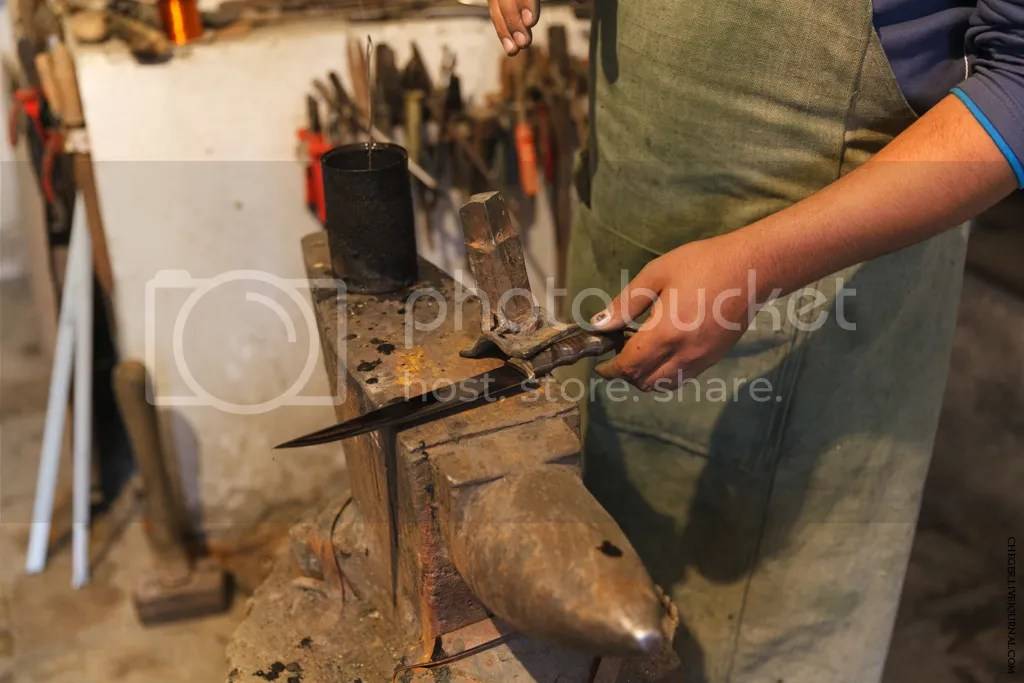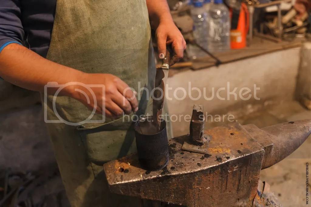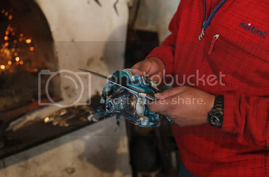 После ковки ножи получают рукоять из стекловолокна, оргстекла, металла, рога, кости, а потом грубо затачиваются на точильном круге