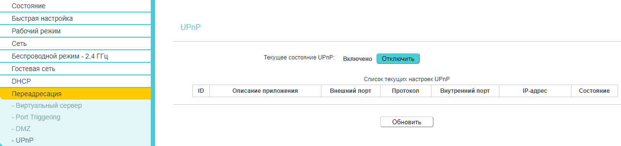Включение технологии UPnP