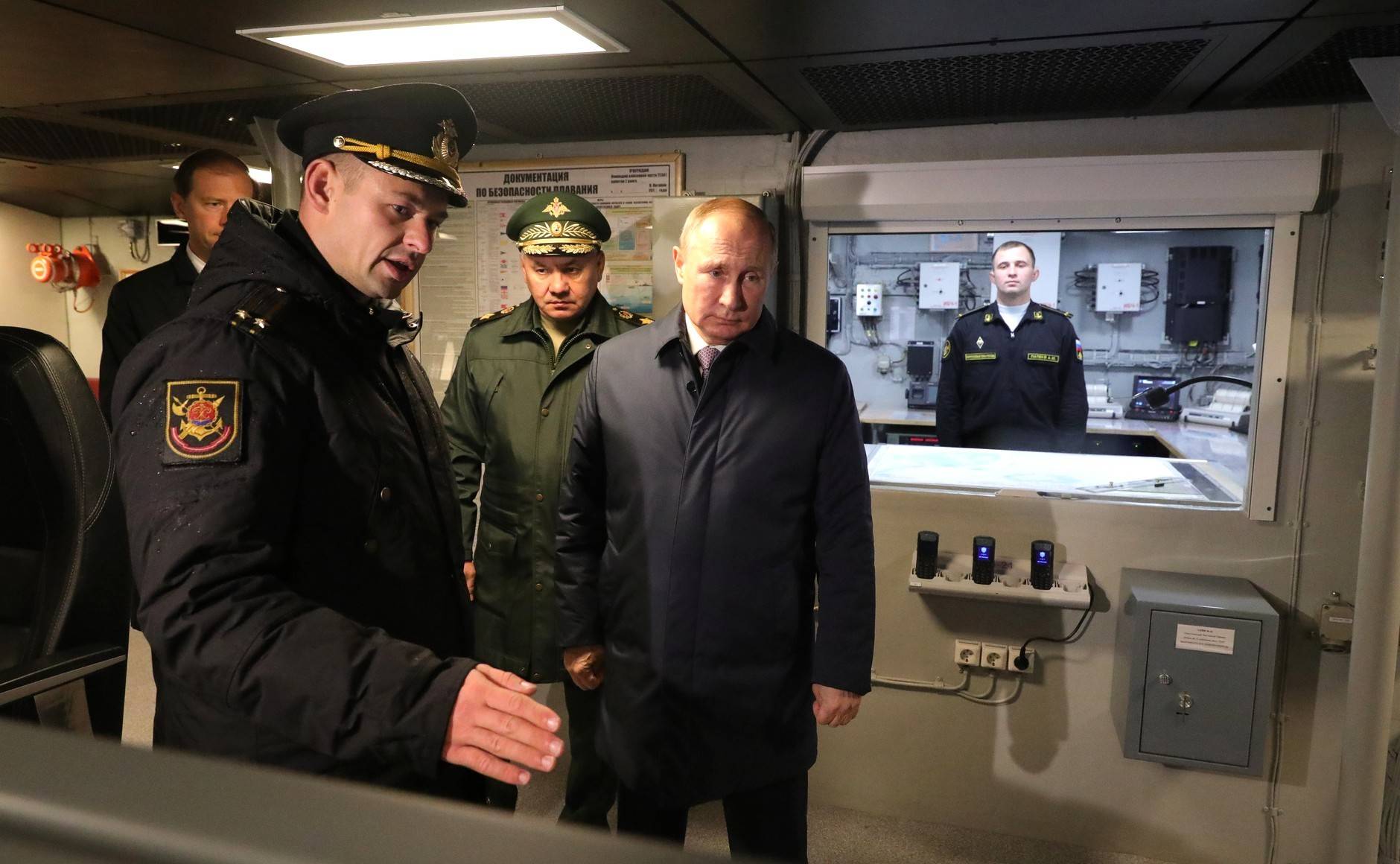 - Владимир Путин посетил Прибалтийский судостроительный завод «Янтарь», где осмотрел корвет «Гремящий». С министром обороны Сергеем Шойгу. Пояснения даёт командир корабля Роман Довгайлов