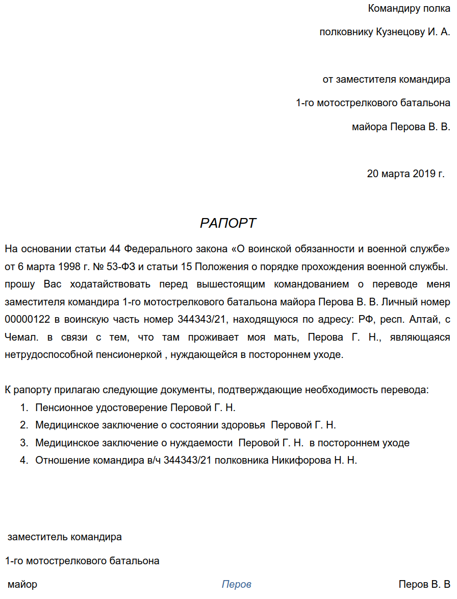 Правила составления рапортов российским законодательством не регламентируется, однако их написание подчиняется общим правилам оформления процессуальных документов. Форум правовой взаимопомощи военнослужащих Написал третий рапорт о переводе по личной просьбе в связи с болезнью матери и то, что нуждается в постоянном постороннем уходе. На третьей аттестационной комиссии решили, что нет необходимости в переводе и опять упомянули Приказ МО №500 — НЕ ПОЛОЖЕНО. Хотя никто мне так и не смог найти подобную фразу в этом приказе, согласно какого пункта не положено мне на вышестоящую должность. Написал четвертый рапорт, что неправильно аргументируют ответ и в случае, если не вынесут положительного решения — я обращусь в СУД! Ответа так и не последовало, рапорт «затерялся где-то в тумане».
