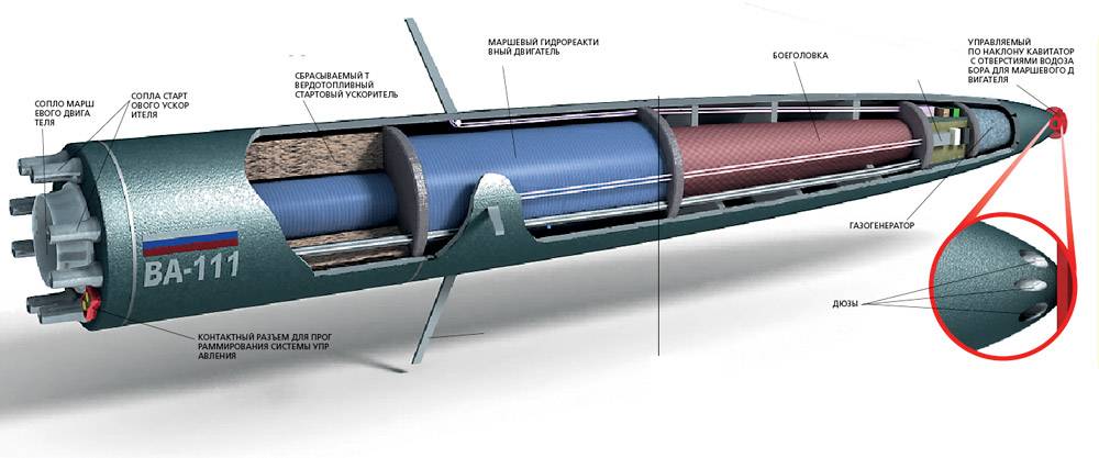 Общее описание внешней баллистики торпеды: высокая скорость обеспечена реактивным двигателем, а сопротивление воды (в 1000 раз больше сопротивления в воздушной среде) преодолено благодаря воздушному “кокону”, обволакивающему весь корпус (8,2 м в длину). Из этого следует – это обычная ракета, плывущая под водой.