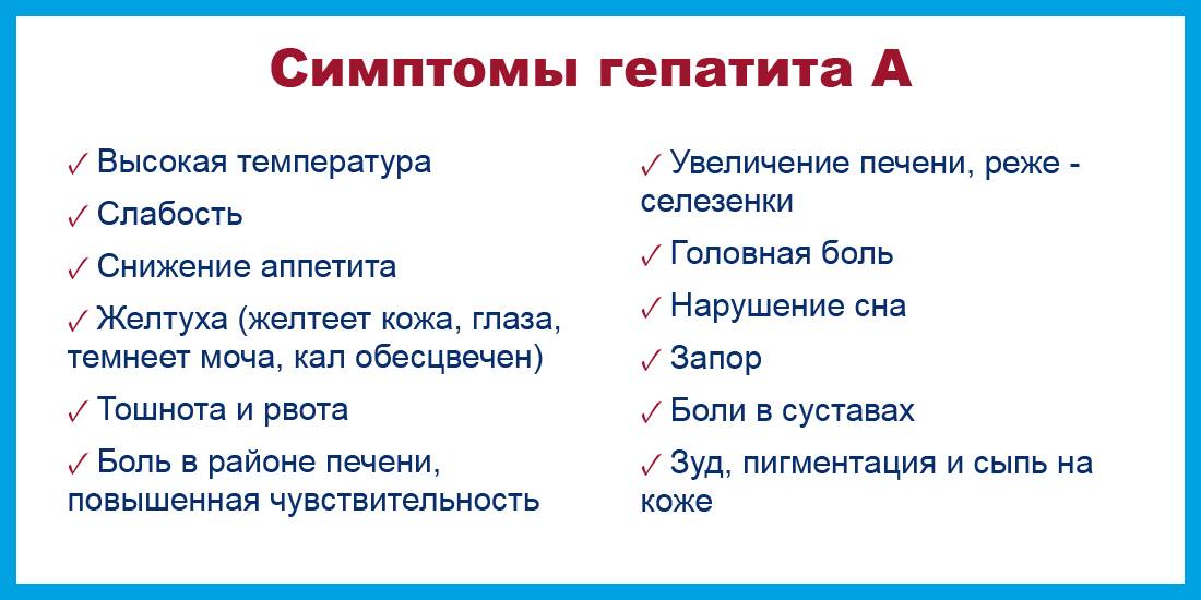 Основными симптомами заболевания являются: слабость, высокая температура, диарея, рвота, боли в правом подреберье, пожелтение кожи, темная окраска мочи. Перенесенная болезнь дает человеку пожизненный иммунитет против инфекции. Верификация гепатита А осуществляется по характерным антителам в сыворотке крови. Из-за высокой заразности желтуха лечится только в условиях стационара.