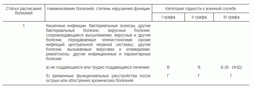 Что касается второй и третьей графы напротив диагноза, имеет смысл держать во внимании столбик “II графа”. Она в том числе включает в себя тех, кто уже служит по призыву и кому в армии был поставлен тот или иной диагноз. Если этот диагноз согласно расписанию болезней означает негодность к службе, военнослужащего обязаны досрочно комиссовать.