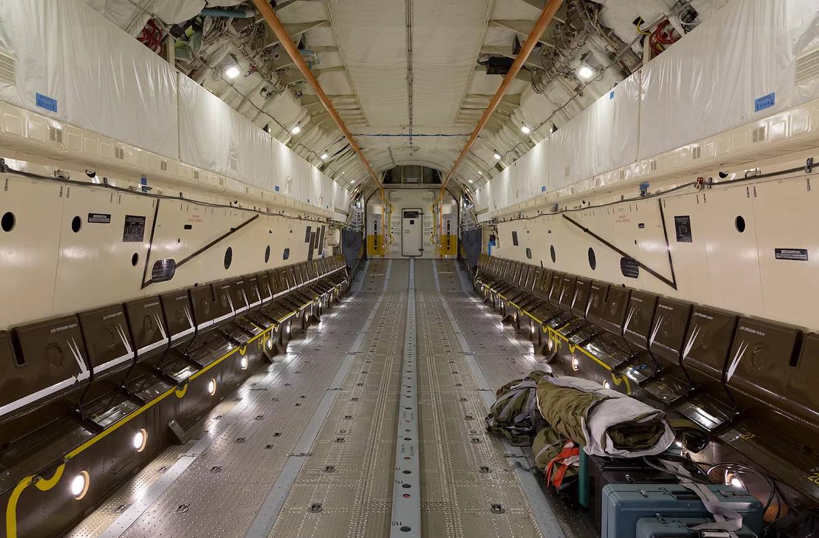 Внутри фюзеляжа оборудованы рольганги, погрузочные десятитонные тельферы и монорельс для движения техники во время десантирования.