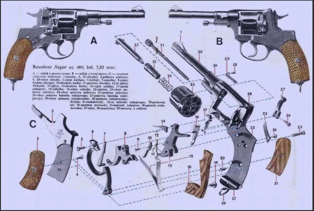 Благодаря использованию точного литья, конструкция ударно-спускового механизма максимально проста, что накладывает свой отпечаток на процесс разборки-сборки леворвера.