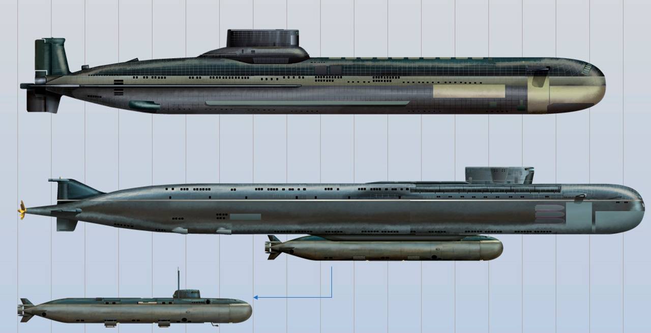 АПЛ проекта 09852 (в центре) – самая большая из когда-либо построенных в России. Однако её водоизмещение уступает аналогичному параметру лодок проекта 941 «Акулы». В нижней части изображения – атомная станция АС-12 «Лошарик».