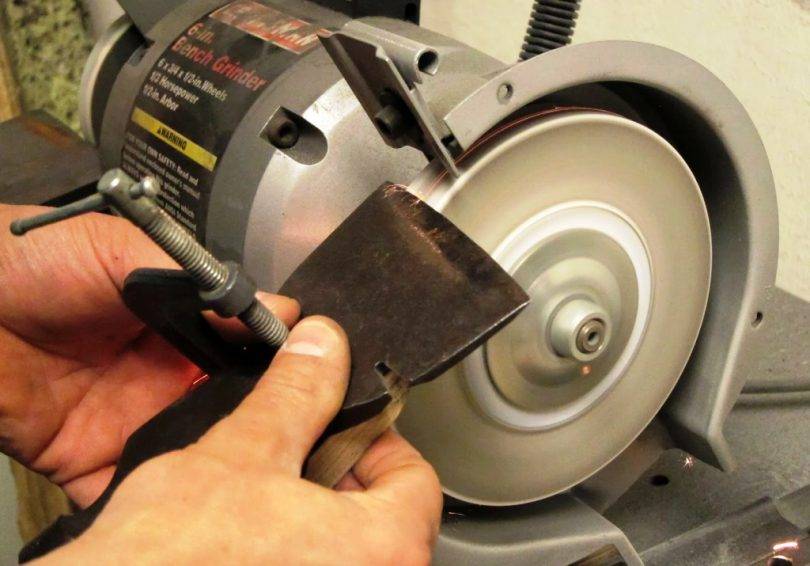Когда вы убедитесь в том, что выбрали правильный угол, надежно зафиксируйте топор и приступайте к его затачиванию. Данная процедура состоит из двух этапов. В первую очередь удаляются все щербинки на поверхности клинка, и формируется новая линия среза. Потом заточка доводится, чтобы получился гладкий срез. Предварительно загладьте абразивный круг двусторонним точильным камнем. При этом топор удерживается двумя руками. Одной держат за топорище, а именно за середину, второй – за обух. На данном этапе нужно время от времени проворачивать инструмент, чтобы он равномерно затачивался с обеих сторон.