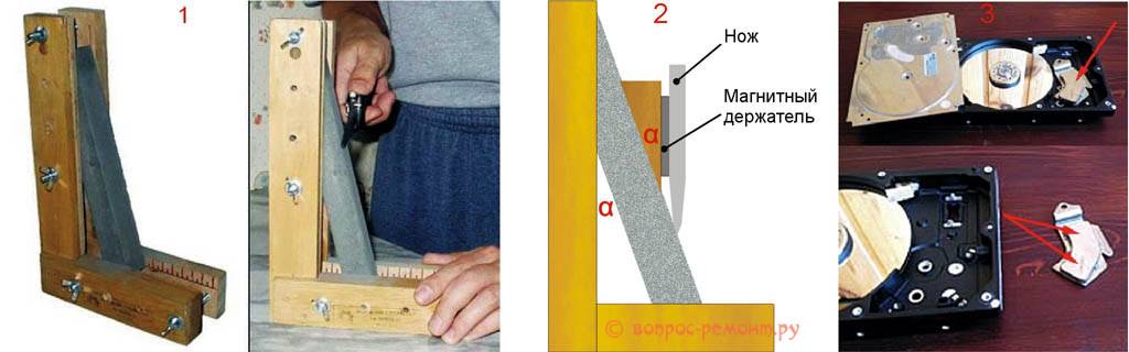 Функция выдерживания угла наклона с оператора при этом снимается, а остальные распределяются на 2 руки. Навык заточки в таком случае вырабатывается сразу, но необходим держатель, прочно удерживающий нож и в то же время позволяющий ему скользить по своей поверхности. Сделать такой можно из магнитов привода каретки головок записи-считывания от негодного HDD дисковода (винчестера). Магниты привода каретки «винта» ниобиевые, тонкие, плоские, ровные и очень сильные (показаны красными стрелками на поз. 3). Их наклеивают РАЗНОИМЕННЫМИ полюсами на стальную полоску, сила притяжения клинка тогда удвоится. А чтобы обеспечить скольжение, держатель обтягивают фторопластовой пленкой толщиной 0,05-0,07 мм. Пойдет и ПЭТ от бутылок, но он толще и притяжение будет слабее. Полиэтилен не годится, сразу протрется.