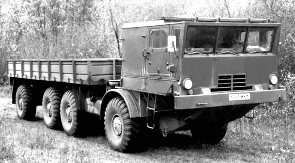 На базе ЗИЛ 135 был собран пробный образец транспортного средства в 1967 году. Он отличался уникальной конструкцией. Колесная база имела схему 4 х 4 + 2 х 2. Такого прежде в истории автомобилестроения не было. Для передних колес применялись стойки с амортизаторами пневмогидравлического типа. Подобные элементы конструкции применялись на некоторых моделях самолетов. Высота подвески благодаря такой инновации могла меняться.