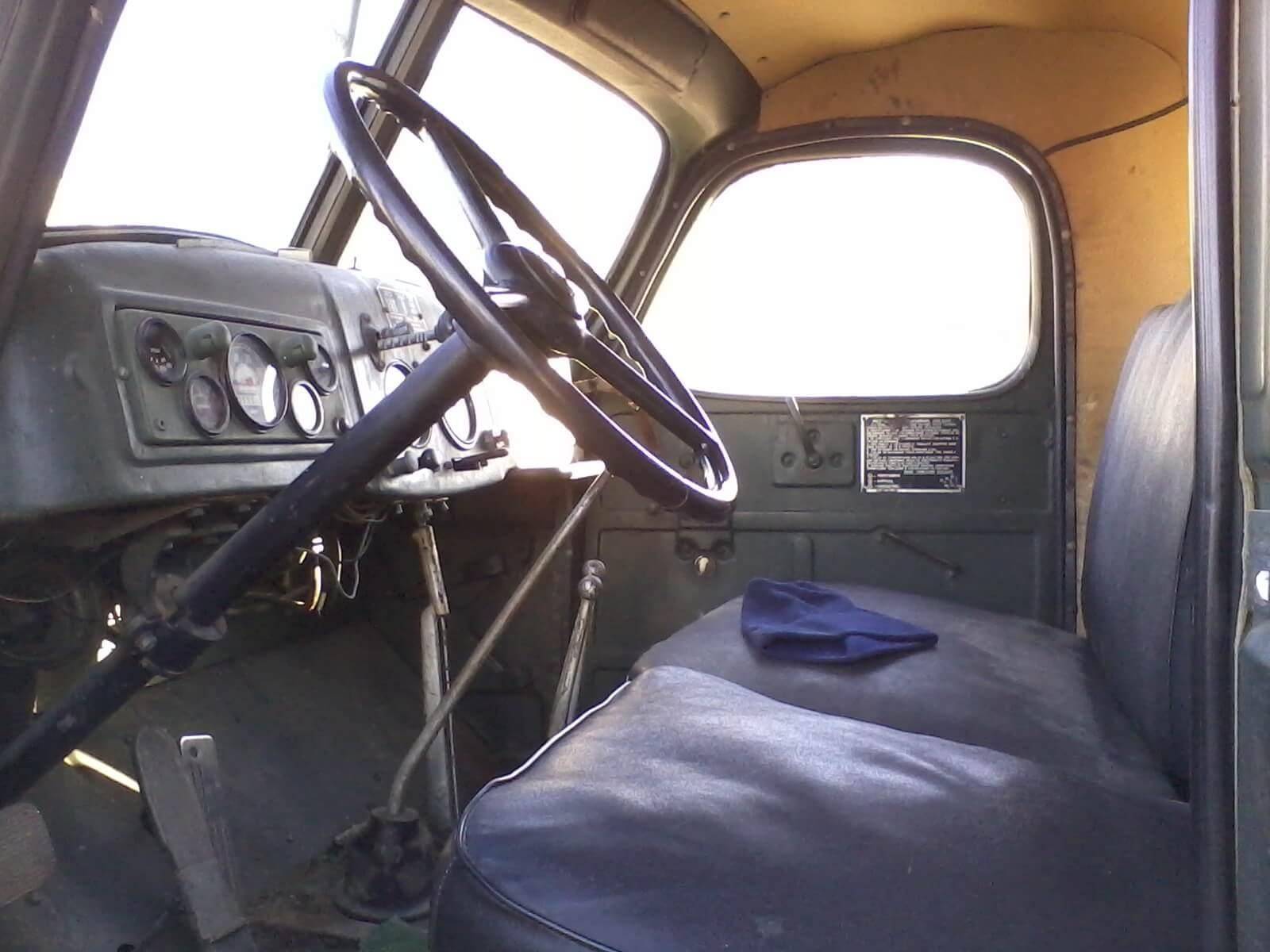 В цельнометаллической кабине ЗИЛ-157 царит на все сто процентов спартанская и брутальная обстановка. Ни о каком комфорте для водителя и двух пассажиров здесь нет и речи. А в каком грузовом автомобиле тех лет было иначе?