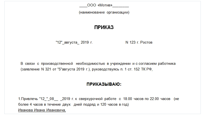 Любая сверхурочная работа начинается с приказа. При необходимости получить согласие работника, зафиксированное на бумаге, и/или профсоюза. Только после проведения работ данные заносятся в журнал.